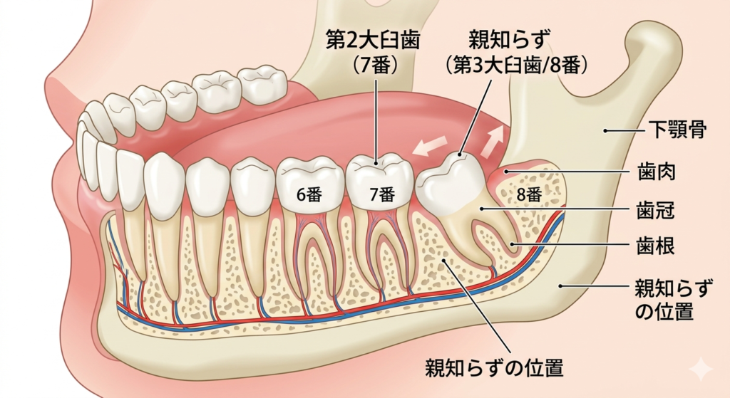 親知らずは、第二大臼歯のさらに奥に生えてくる歯で、真ん中の歯(中切歯、門歯)から数えて8番目の歯です。一般的には20歳前後で萌出してくることが多いですが、人によってはもっと遅く生えてきたり、生えてこない方もいます。昔、今よりも平均寿命が短い時に、親が亡くなってから生えてくる歯として、『親が知らない歯=親知らず』と名付けられたとも言われています!