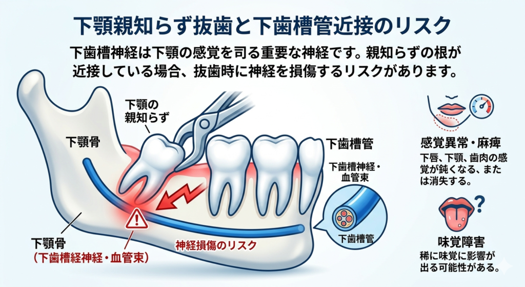 下顎の親知らずを抜歯する場合、下顎の骨の中に存在する下歯槽管という神経の管に損傷が加わると1時的に痺れや痛みを伴う可能性があります。術前の検査で、親知らずの下歯槽管近接を疑う場合は、CT画像を撮影し、術前に確認することが望ましいでしょう。