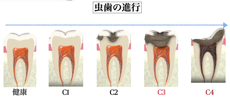 日々の飲み物はお水やお茶などがおすすめで、お砂糖が入った飲み物や日中のお砂糖が入ったお菓子のちょこちょこ食べは注意しましょう!虫歯治療は好きな治療を選べるわけではなく、虫歯の大きさに応じて変わります。特に、虫歯が歯の歯髄といわれる部分まで進行すると、神経が腐り、その場合は根管治療という神経の治療が必要になります。また、虫歯が進行しすぎると、歯を保存することが難しくなり、抜歯適応となることもあります。